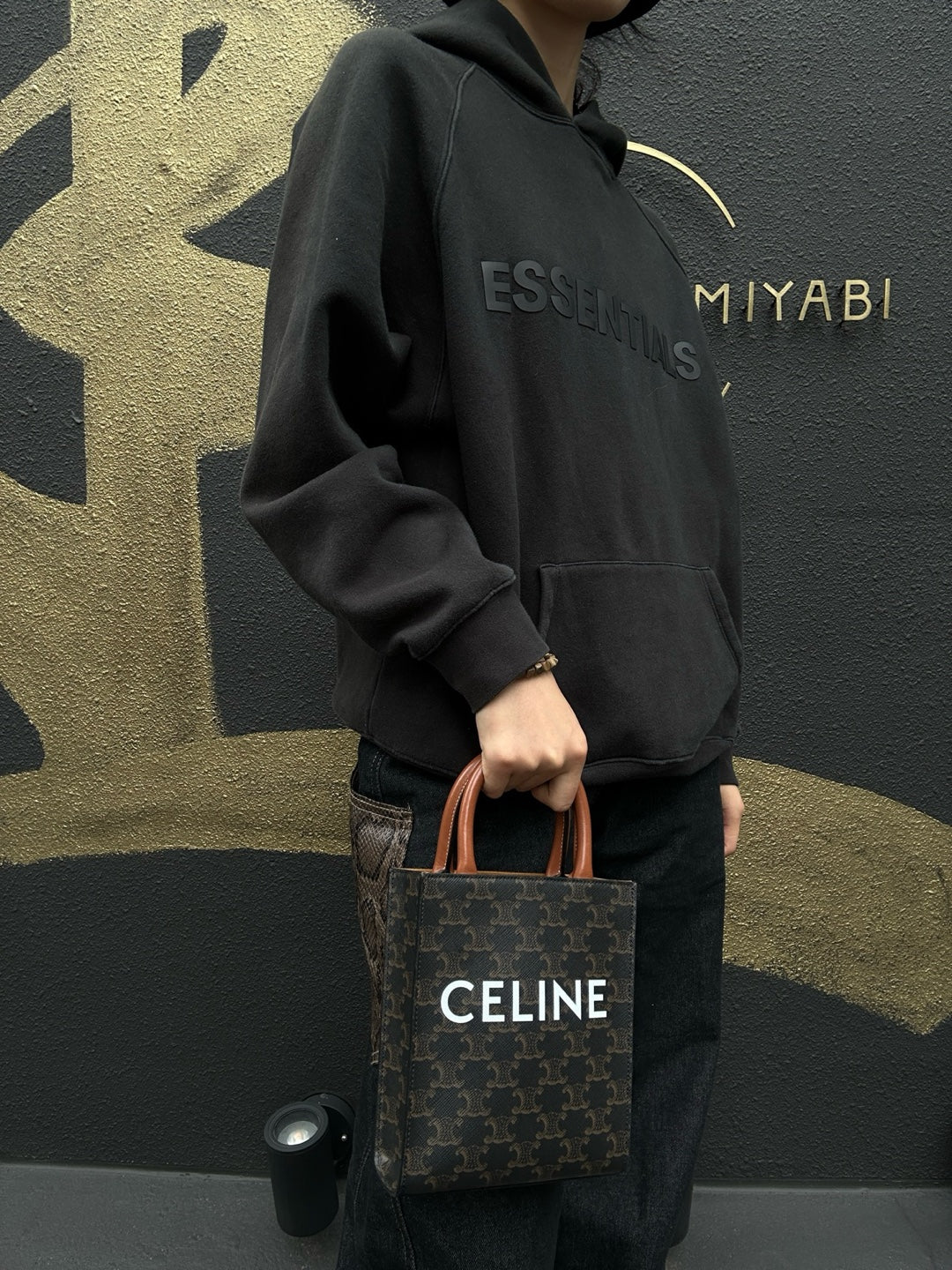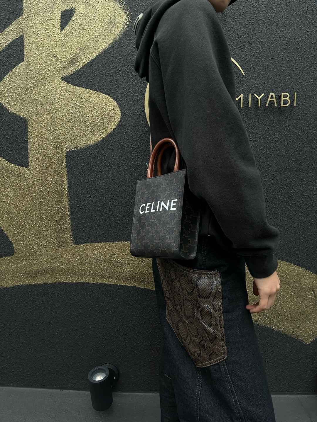 CELINE Mini Vertical Triomphe Handbag, Calfskin/Coated Canvas, Brown, Dust Bag Included